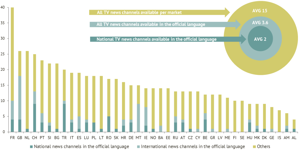 - On average, only one in four TV news channels available in a given European market broadcasts in that market’s official language
