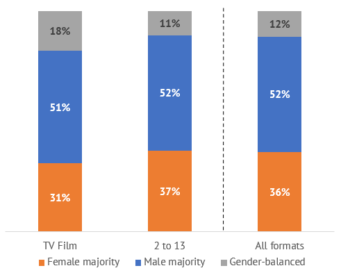 68% of TV fiction titles were the work of writers’ teams, of which 36% were written by writers of both genders and 13% by gender-balanced teams of writers.