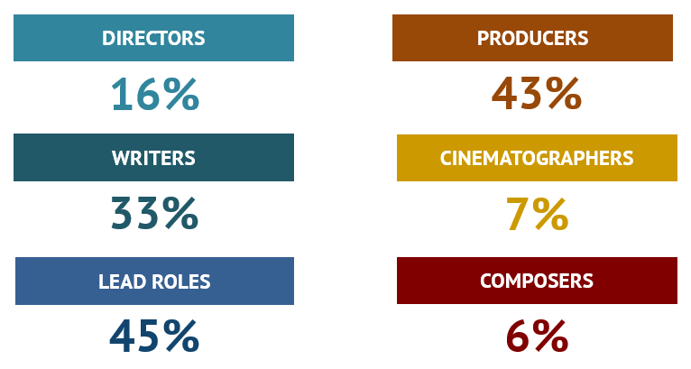 Between 2015 and 2019, women accounted for 43% of active actors in a lead role in audiovisual fiction titles in the EU, although the weighted share of women among lead roles was 45%.