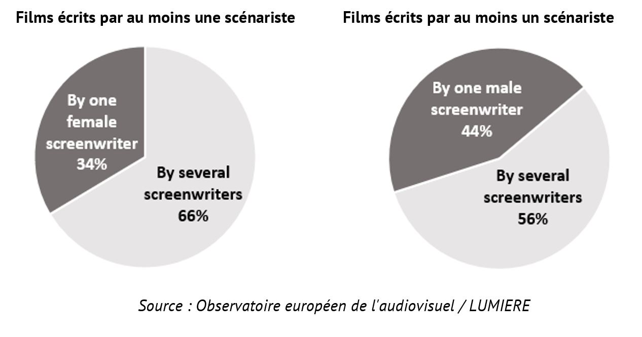 Cette tendance se retrouve en particulier dans les domaines où les professionnels travaillent généralement en équipe, comme pour la production ou l’écriture de scénarios. Si l’on prend l’exemple des scénaristes, seuls 34 % des longs métrages ont été écrits par une seule femme, contre 44 % des films écrits par un seul homme. Parmi les longs métrages dont le scénario est signé par au moins une femme, 86 % ont été co-écrits avec au moins un scénariste masculin.