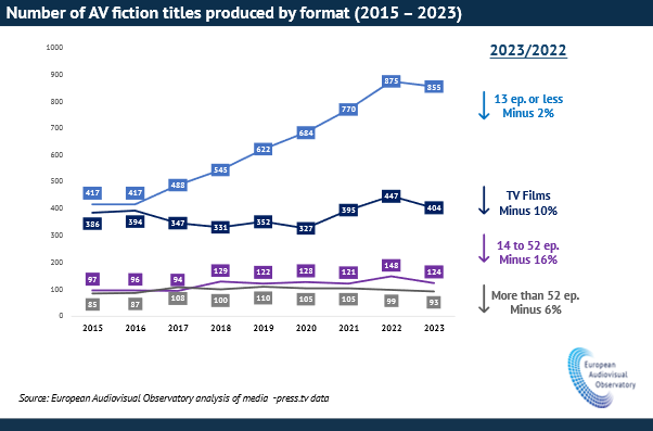• 2023 ist die TV-Fiktionsproduktion in Europa an einem Wendepunkt angelangt - über alle Formate hinweg ging die Anzahl der Titel um 6 % zurück.