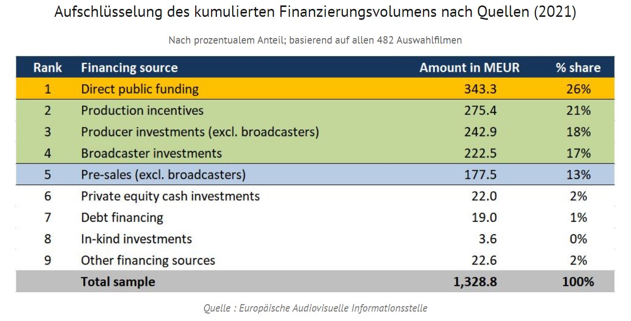 2021 beruht die Finanzierung europäischer Kinospielfilme weiterhin in erster Linie auf fünf unterschiedlichen Finanzierungsquellen: direkte öffentliche Förderung, Produktionsanreize, Investitionen von Rundfunkveranstaltern, Investitionen von Produzenten und Vorabverkäufe. (Investitionen von Rundfunkveranstaltern umfassen sowohl Koproduktionsinvestitionen von Rundfunkveranstaltern als auch Vorabverkäufe an Rundfunkveranstalter mit Sitz in einem der koproduzierenden Länder. Vorabverkäufe umfassen nationale und internationale Vorverkäufe; Vorabverkäufe im Herkunftsland.)