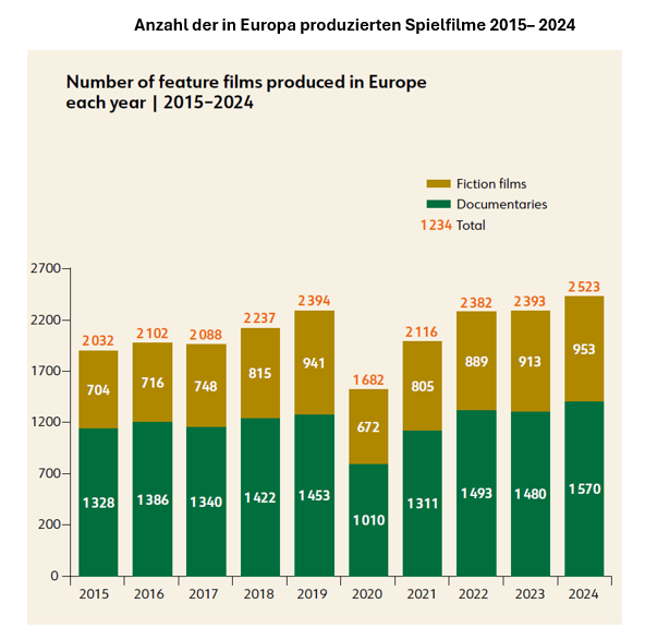 Die europäische Filmproduktion erreichte 2024 mit 2523 produzierten Spielfilmen in 36 Märkten einen historischen Höchststand, was eine starke Erholung und ein anhaltendes Wachstum seit der Pandemie bestätigt. Der Anstieg ist sowohl auf Fiktions- als auch Dokumentarproduktionen zurückzuführen; gleichzeitig sind die Produktionsbudgets in weiten Teilen Europas ebenfalls weiter gestiegen.