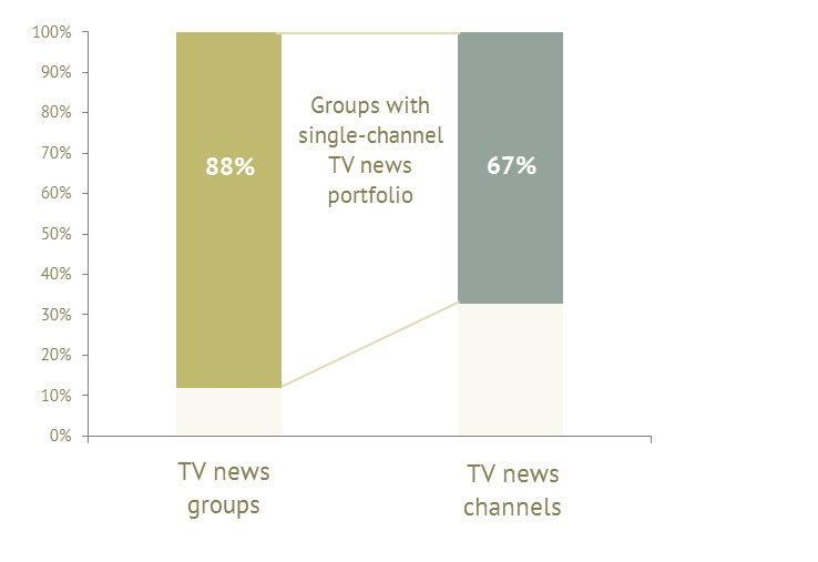 67 % aller TV-Nachrichtensender mit Sitz in Europa sind im Eigentum von Mediengruppen mit nur einem Nachrichtensender. Rund 80 Mediengruppen betreiben auf dem Gebiet Europas TV-Nachrichtensender. 88 % dieser Rundfunkgruppen besitzen nur einen TV-Nachrichtensender, der in Europa ansässig und verfügbar ist. Zwar dominieren private Rundfunkveranstalter bei den TV-Nachrichtensendern, fast jeder dritte TV-Nachrichtensender - und somit deutlich mehr als andere Arten von TV-Sendern - erhält jedoch Unterstützung vom öffentlichen Sektor.