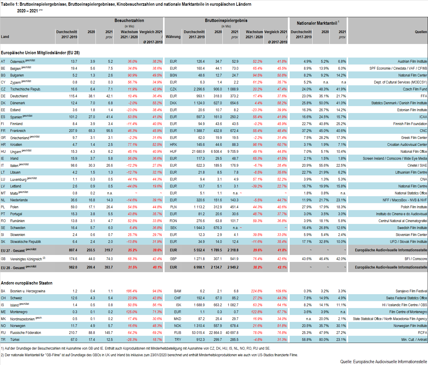 Die in Tabelle 4 dargestellten vorläufigen Marktanteile in Europa 28, das heißt in der Europäischen Union und im Vereinigten Königreich, im Jahr 2021 basieren auf den Besucherzahlen der einzelnen Filme, die in der Datenbank LUMIERE mit Stand vom 25. April 2022 erfasst waren. Zu diesem Zeitpunkt waren hiermit rund 97 % der Kinobesuche in 26 EU-Staaten und im Vereinigten Königreich abgedeckt, für die Daten verfügbar waren. Auf Grund einiger Lücken in der Erfassung und Bereitstellung der Daten in verschiedenen Ländern ist eine 100%ige Abdeckung der Besucherzahlen derzeit nicht möglich.