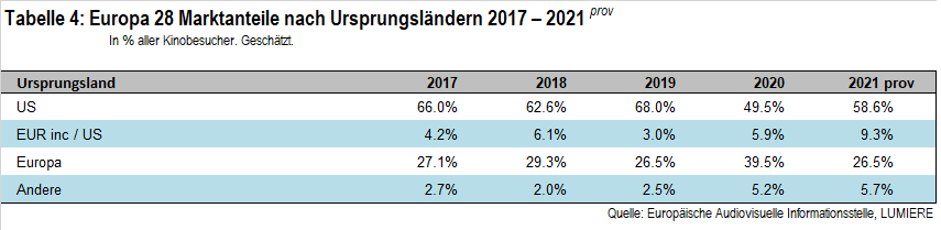 Während europäische Filme 2020 von der Abwesenheit US-amerikanischer Blockbuster profitierten, stiegen die Besucherzahlen 2021 vor allem wieder wegen der Rückkehr solcher Blockbuster. Für US-Filme wurden 2021 geschätzt 230 Mio. Eintrittskarten verkauft, 82 Mio. mehr als 2020, während die Zahl der Zuschauer europäischer Filme von geschätzten 118 Mio. 2020 auf 104 Mio. 2021 zurückging. Im Vergleich dazu wurden vor der Pandemie durchschnittlich 644 Mio. Eintrittskarten für US-amerikanische und 271 Mio. für europäische Filme verkauft. Der Marktanteil europäischer Filme sank daher von seinem außergewöhnlichen Rekordhoch von 39,5 % im Jahr 2020 auf 26,5 %, was durchaus im normalen Bereich liegt. Der Marktanteil der US-Produktionen hingegen stieg von seinem Rekordtief von 49,5 % im Jahr 2020 auf 58,6 %, was immer noch unter dem Niveau vor der Pandemie liegt, während europäische Filme mit Investitionen von US-Studios, angeführt von Keine Zeit zu sterben (GB inc /US), und Filme aus dem Rest der Welt überdurchschnittliche Marktanteile von 9,3 % beziehungsweise 5,7 % erzielten.