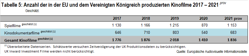 Eine Abschätzung der Gesamtzahl der in der EU produzierten Kinofilme ist immer noch schwierig. Gründe hierfür sind im Wesentlichen zum einen das Risiko, dass Koproduktionen doppelt gezählt werden, und zum anderen die national unterschiedlichen Verfahren bei der Erfassung dieser Daten. In der Gesamtzahl für die Europäische Union werden abendfüllende Kinofilme berücksichtigt, nicht jedoch Koproduktionen mit Minderheitsbeteiligung sowie US-amerikanische und ausländische Koproduktionen im Vereinigten Königreich. Für einige Länder sind keine separaten Datensätze für Spielfilme und Dokumentarfilme verfügbar.