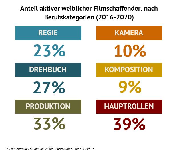 Zwischen 2016 und 2020 stellten Frauen lediglich 23 % aller Regieführenden europäischer Spielfilme. Bei den Fachkräften, die „hinter der Kamera“ arbeiten, war der Frauenanteil in den Bereichen Produktion (33 %) und Drehbuch (27 %) etwas höher. Bei Komposition und Kamera wiederum war das Geschlechtergefälle noch ausgeprägter: Nur 9 % beziehungsweise 10 % der aktiven Fachkräfte waren Frauen. Die Analyse zeigt, dass die Präsenz von Frauen „vor der Kamera“ ausgewogener war: 39 % aller Darstellenden in einer Hauptrolle in einem Spielfilm waren Frauen.