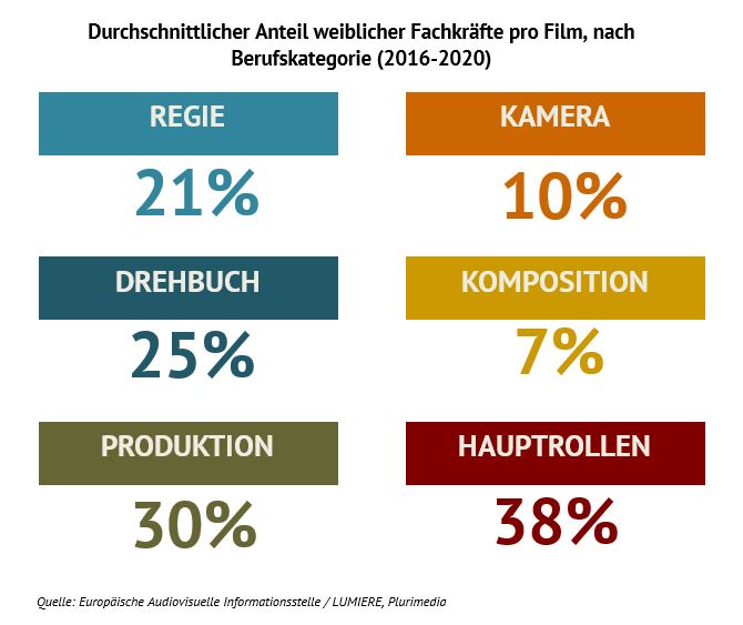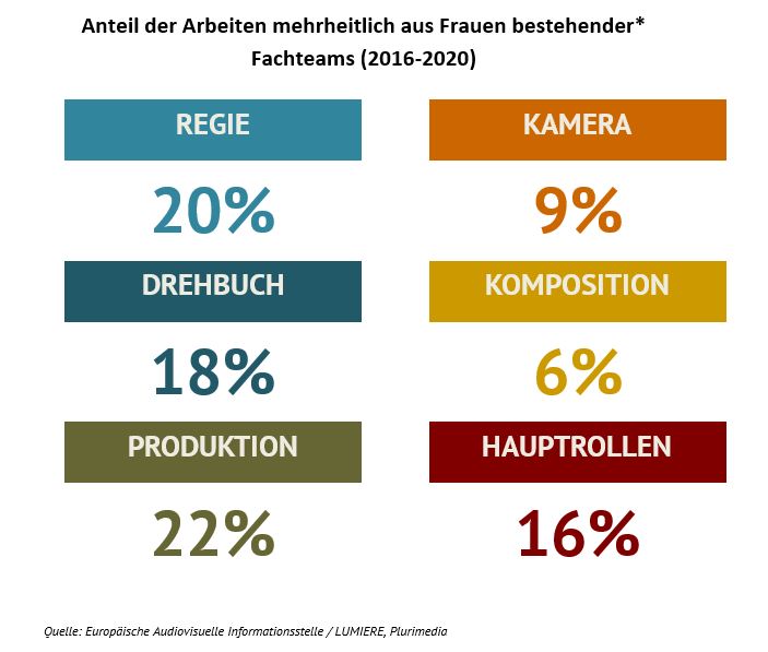 Zwischen 2016 und 2020 wurden nur für 18 % der europäischen Spielfilme Drehbücher von einem mehrheitlich aus Frauen bestehenden Team (das heißt von einer Mehrheit weiblicher Fachkräfte in der Rolle der Drehbuchschreibenden) geschrieben. Im Bereich Produktion lag der Anteil der von mehrheitlich aus Frauen bestehenden Teams produzierten Filme bei 30 %. Bei Kamera (10 %) und Komposition (7 %) ist diese Zahl deutlich niedriger.