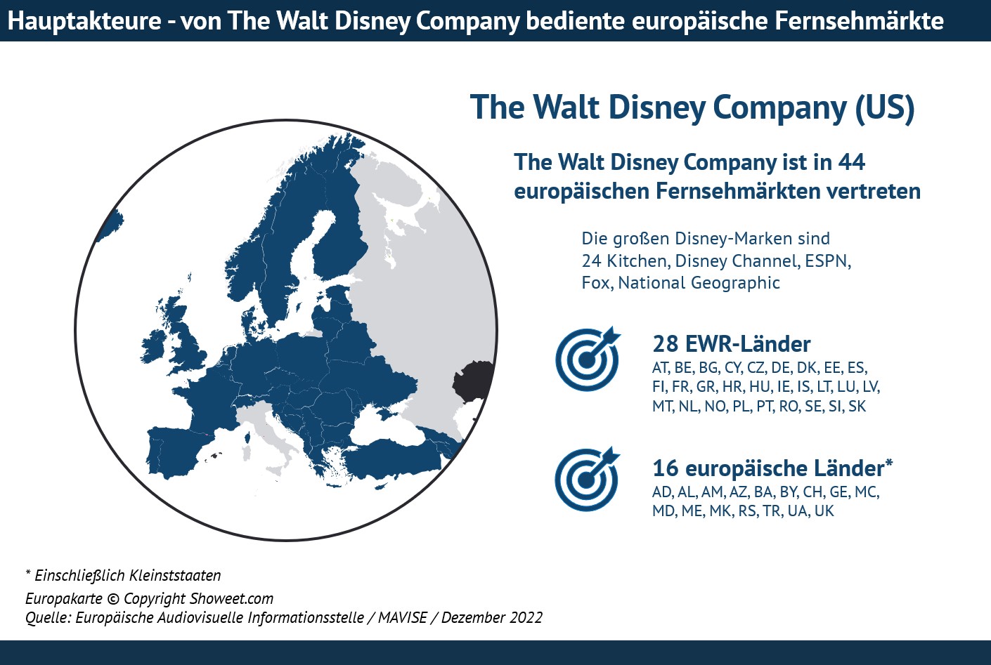 US-Akteure haben mit Abstand die meisten operativen Märkten in Europa. The Walt Disney Company zum Beispiel ist mit ihrer Tätigkeit in 44 europäischen Fernsehmärkten praktisch omnipräsent.