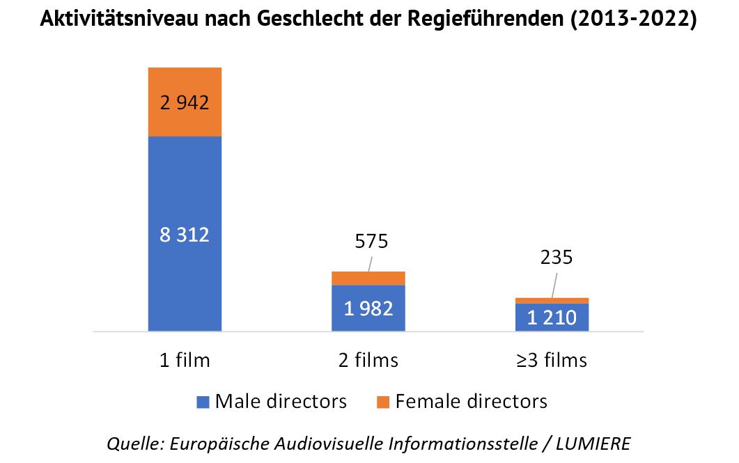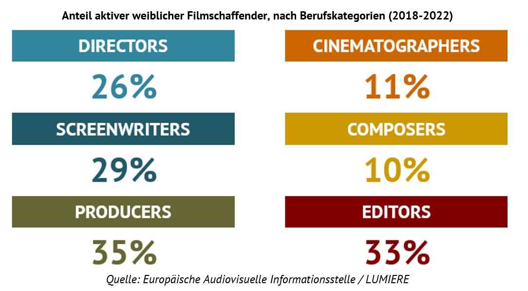 - Frauen sind unter den Beschäftigten immer noch stark unterrepräsentiert. Lediglich 26 % der Regieführenden europäischer Spielfilme sind weiblich.