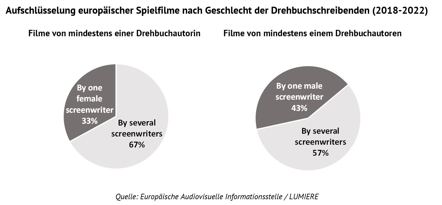 Dies ist insbesondere beim Drehbuch festzustellen, einer Rolle, bei der es üblich ist, dass mehrere Fachleute in Teams arbeiten. Lediglich 33 % der Spielfilmdrehbücher wurden von einer einzelnen Autorin geschrieben, während 43 % der Filmdrehbücher von einem einzelnen männlichen Autor stammten. Darüber hinaus arbeiteten weibliche Fachkräfte eher in gemischtgeschlechtlichen Teams als Männer. Spielfilme, die von mindestens einer Drehbuchautorin mitgeschrieben wurden, wurden zu 86 % in Zusammenarbeit mit mindestens einem männlichen Kollegen geschrieben.