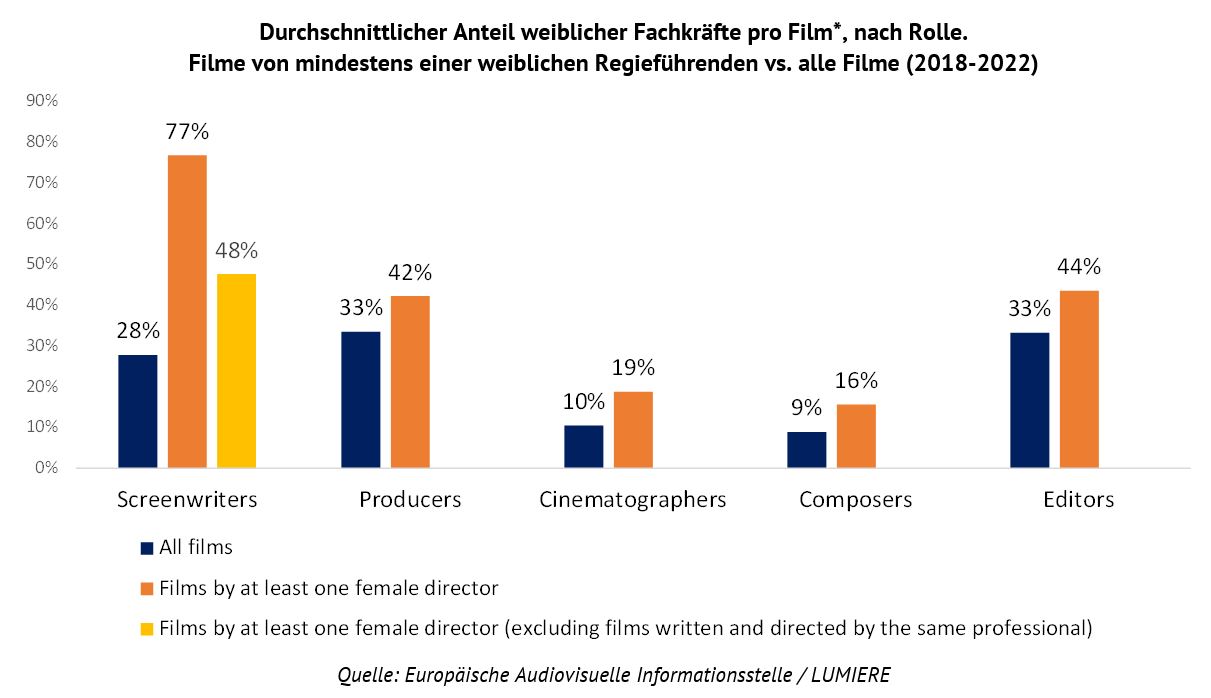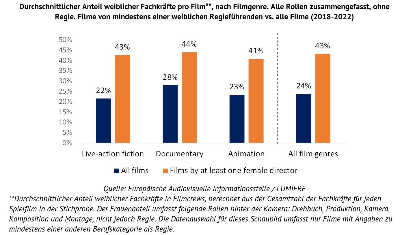 Frauen sind unter den Filmschaffenden, die in Schlüsselrollen hinter der Kamera arbeiten, nach wie vor in der Minderheit. Zwischen 2018 und 2022 stellten Frauen beispielsweise lediglich 26 % aller Regieführenden bei europäischen Spielfilmen. Deutlicher ausgeprägt war das Geschlechtergefälle bei Kamera und Komposition, wo Frauen lediglich 11 % beziehungsweise 10 % der Beschäftigten ausmachten. Bei Produktion (35 %) und Drehbuch (29 %) wiederum war der Frauenanteil höher.