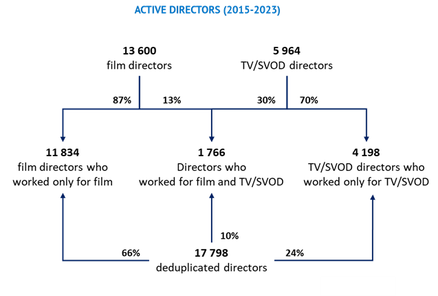 TV-/SVoD-Aufträge sind proportional auf weniger aktive Fachpersonen verteilt als Filmaufträge. Die Arbeit im Bereich TV-/SVoD-Fiktion bedeutet mehr Wiederholungen, wobei bestimmte Serien über mehrere Staffeln laufen. Umgekehrt scheint der Bereich des Kinofilms strukturell offen für Neulinge zu sein (im Durchschnitt haben zwischen 2015 und 2023 51 % der im jeweiligen Jahr aktiven Regieführenden bei Kinofilmen ihren ersten Kinofilm gedreht).