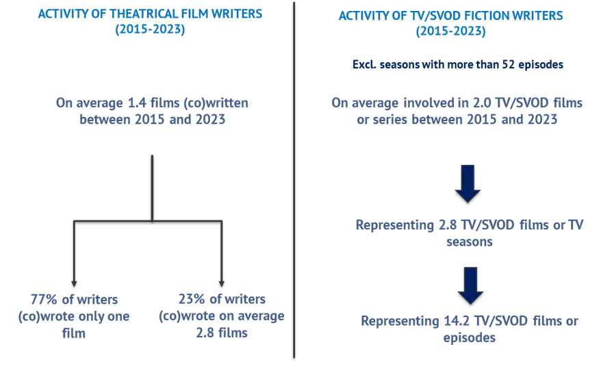 Daraus ergibt sich ein sehr unterschiedliches Aktivitätsniveau zwischen den beiden Inhaltskategorien: Zwischen 2015 und 2023 verfassten Drehbuchschreibende für Kinofilme 1,4 Filme gegenüber 2,8 SVoD-Fiktionsfilmen oder -Staffeln bei Drehbuchschreibenden für TV/SVoD (ohne Staffeln mit mehr als 52 Folgen).