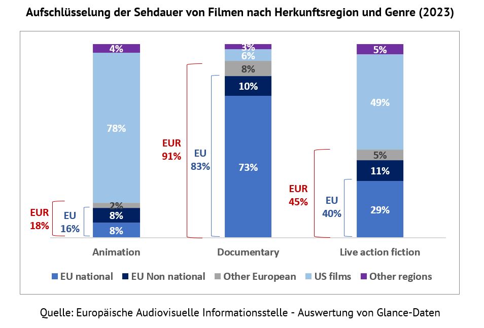 Berücksichtigt man sowohl im Kino gezeigte als auch nicht gezeigte Filme, so machen Spielfilme mehr als 90 % sowohl der Filmausstrahlungen als auch der Sehdauer aus. Dokumentarfilme aus der Europäischen Union sind besonders erfolgreich; europäische Animationsfilme hingegen sind zum einen unter den Animationsfilmen jeglicher Herkunft unterrepräsentiert und zum anderen ist ihr Anteil an der Sehdauer geringer als ihr Anteil an den Ausstrahlungen.