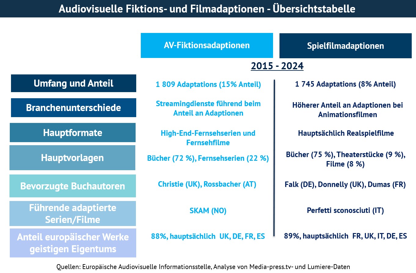 Der Trend „vom Buch auf Bildschirm und Leinwand“ wird weitgehend von europäischen Werken geistigen Eigentums getragen – fast 90 % aller Adaptionen basieren auf europäischen Werken, wobei Autoren aus Frankreich, Deutschland, Italien, Spanien und dem Vereinigten Königreich an der Spitze stehen. Die Branche zeigt eine ausgesprochene Vorliebe für zeitgenössische Stimmen: Fast 70 % der adaptierten Bücher wurden erstmals im 21. Jahrhundert veröffentlicht. Unter anderem Ikonen wie Agatha Christie und die Krimiautorin Claudia Rossbacher liefern die meisten Vorlagen für audiovisuelle Fiktionsadaptionen, während die Krimiautorin Rita Falk, die Kinderbuchautorin Elfie Donnelly und der französische Klassiker Alexandre Dumas die Hitliste bei den Spielfilmadaptionen anführen.