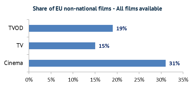 Der Anteil der nicht-nationalen Filme aus der Europäischen Union an der Gesamtheit der in Kino, Fernsehen oder TVOD gezeigten Filme liegt zwischen 15% und 31%.