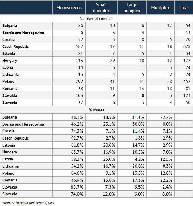 Betrachtet man die in dieser Analyse erfassten zwölf osteuropäischen Länder gemeinsam, hat der größte Teil der Menschen, die im Umkreis von 30 Autominuten ein Kino erreichen können, Zugang zu einem Einzelkino (79,5%), während nur 43,3% der Bevölkerung Zugang zu großen Miniplexen, 38,8% zu Multiplexen und 38,7% zu kleinen Miniplexen hat. Dies zeigt, dass – meist in den Stadtzentren gelegene – Einzelkinos in der Region klar dominieren. Es bedeutet jedoch nicht, dass die meisten Kinokarten für Einzelkinos verkauft würden, denn es besteht kein direkter Zusammenhang zwischen der Erreichbarkeit eines Kinotyps und dessen Besucherzahlen.