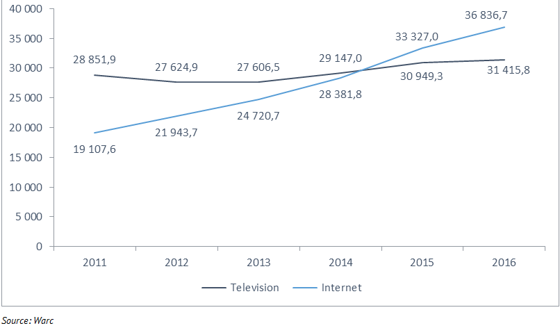 Der gesamte Werbemarkt wuchs im Zeitraum von 2011 bis 2016 um 14% von EUR 88,8 Mrd. auf EUR 101,3 Mrd., in erster Linie durch Online-Werbung, die sich in dieser Zeit fast verdoppelte.