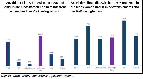 Insgesamt war eine Mehrheit (56 %) der europäischen Filme, die zwischen 1996 und 2020 in die Kinos kamen, im Mai 2020 bei VoD verfügbar. Der Anteil ist geringer als bei US-Filmen, da aber viel mehr europäische Filme als US-Filme in den Kinos laufen, ist die Anzahl der europäischen Filme, die es vom Kino zu VOD geschafft haben, in absoluten Zahlen 2,6 Mal höher als die der US-Filme.