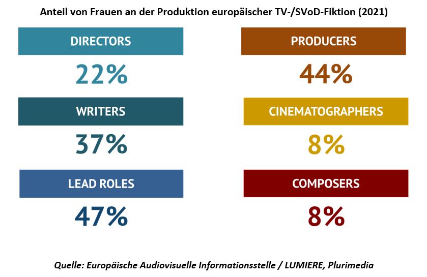 Der Anteil der weiblichen Fachkräfte in der Produktion europäischer TV-Fiktion reicht von weniger als 10 % (Musik, Kamera) bis zu über 40 % (Produktion, Hauptrollen). 37 % der TV-Fiktionsfolgen wurden 2021 von Drehbuchautorinnen geschrieben, jedoch nur 22 % unter weiblicher Regie gedreht.