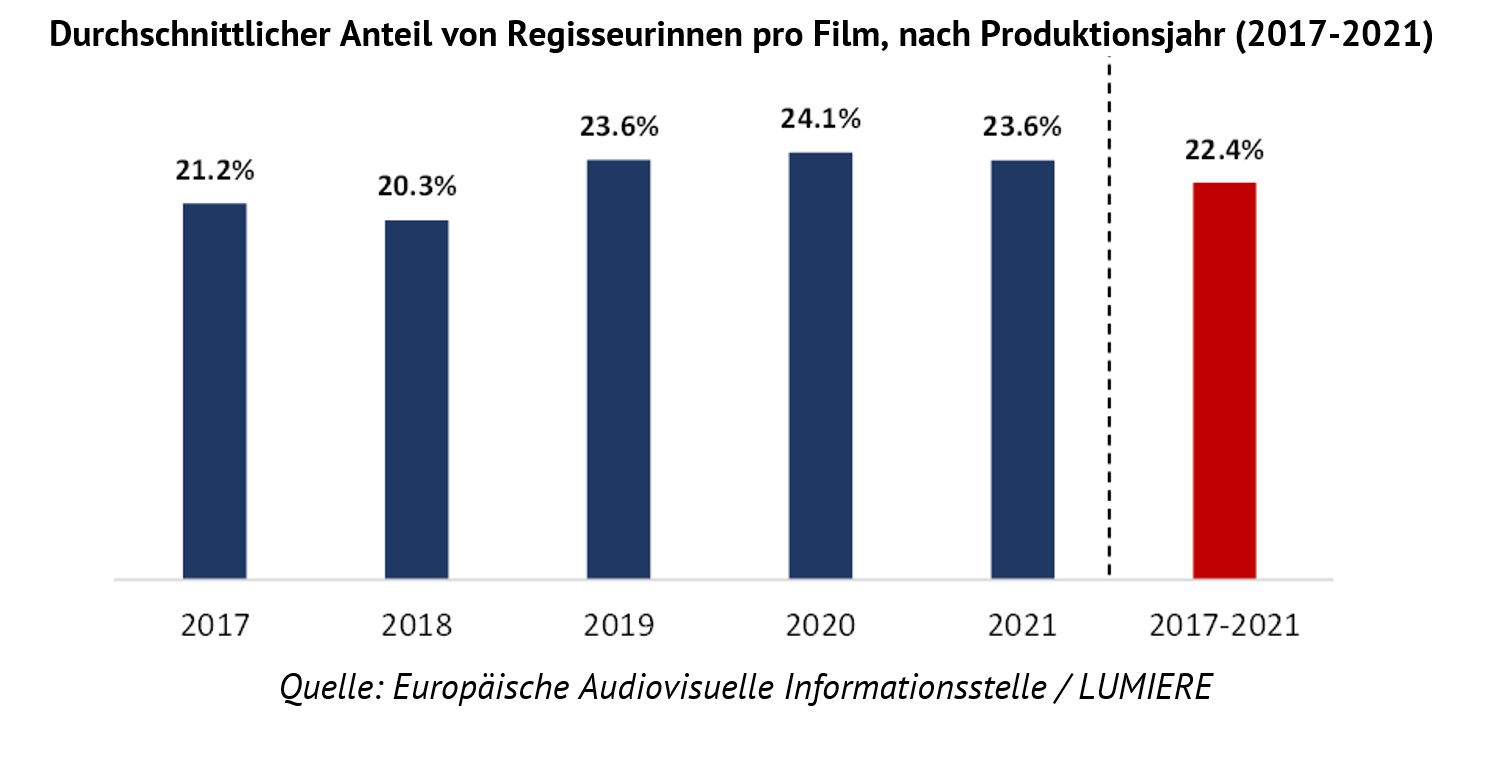 Im Durchschnitt wirkten weibliche Fachkräfte in Filmteams im untersuchten Zeitraum an etwas weniger Spielfilmen mit als ihre männlichen Kollegen. Betrachtet man den Anteil von Frauen und Männern an der Gesamtzahl der Regieführenden jedes Films, so lag der durchschnittliche Anteil von Regisseurinnen pro Film zwischen 2017 und 2021 bei nur 22 %. Diese Zahl ist niedriger als der Frauenanteil unter allen aktiven Regieführenden (25 %).