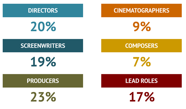 - Eine Minderheit der Spielfilme wurde von mehrheitlich weiblichen Fachteams gedreht. So wurden zum Beispiel lediglich 19 % der Filme von einem weiblich dominierten Drehbuchteam geschrieben (das heißt von einer Mehrheit weiblicher Fachkräfte in der Rolle der Drehbuchschreibenden).