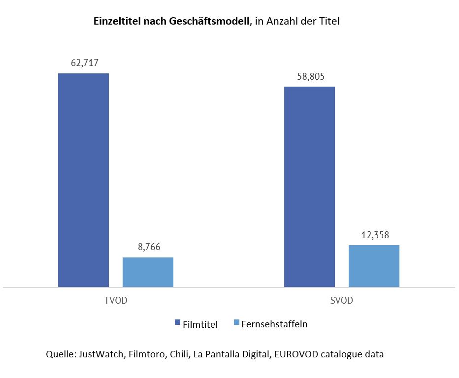 Insgesamt gibt es bei TVoD siebenmal mehr einzelne Filmtitel als einzelne Fernsehstaffeln (62.717 einzelne Filmtitel gegenüber 8.766 einzelnen Fernsehstaffeln) und 4,75-mal mehr einzelne Filmtitel als Fernsehstaffeln bei SVoD (58.805 einzelne Filmtitel gegenüber 12.358 einzelnen Fernsehstaffeln)