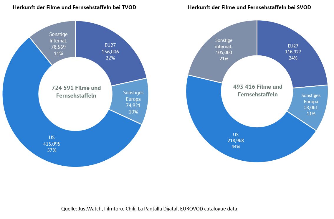 Europäische Inhalte machen 32 % aller bei TVoD verfügbaren Inhalte und 35 % aller SVoD-Inhalte (Filme und Fernsehserien) aus, in absoluten Zahlen sind jedoch mehr europäische Inhalte bei TVoD verfügbar.