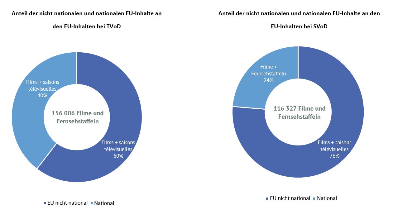 TVoD (40 % nationale Inhalte) hat einen höheren Anteil an nationalen Filmen und Fernsehinhalten als SVoD-Dienste (24 % nationale Inhalte), die Mehrheit der EU-Inhalte bei VoD ist jedoch nicht national.