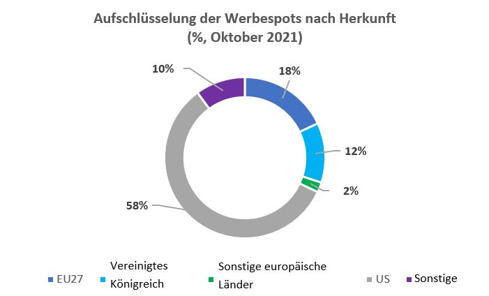 Die Analyse der Homepages einer Auswahl von 54 TVoD-Diensten in neun europäischen Ländern zeigt, dass auf europäische Werke 32 % der Werbespots entfallen, davon 18 % für EU27-Werke. In allen betrachteten Ländern mit Ausnahme des Vereinigten Königreichs und Frankreichs wirbt die Mehrheit der Spots für europäische Werke für nicht nationale Titel.