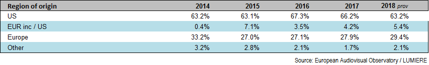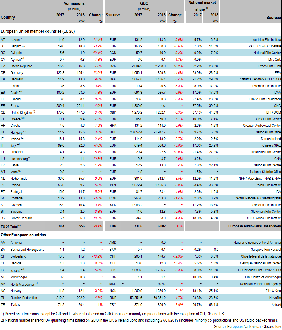 Der Rückgang bei den Besucherzahlen in der EU ist 2018 in erster Linie auf sinkende Zahlen bei US-Filmen zurückzuführen, was einen geschätzten US-Marktanteil von 63,2 % gegenüber 66,2 % im Vorjahr bedeutet. Der Marktanteil, den europäische Filme für sich verbuchen konnten, stieg im Gegenzug von 27,9 % auf 29,4 %. Dies ist der zweithöchste Wert in den letzten fünf Jahren. Auf nationaler Ebene waren lokale europäische Filme besonders im Vereinigten Königreich (44,8 %), Frankreich (39,5 %), Polen (33,3 %) und Dänemark (29,8 %) erfolgreich. Außerhalb der EU war die Türkei das europäische Gebiet mit dem höchsten nationalen Marktanteil (63,4 %).