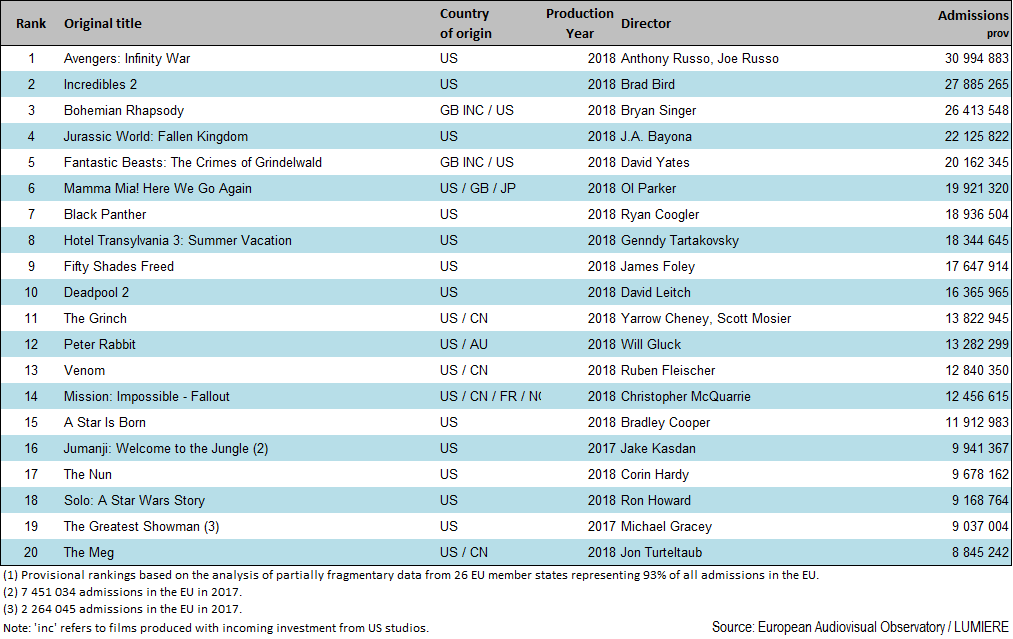 Erneut stürmten US-Studios 2018 mit 18 der 20 Top-Titel die EU-Kinocharts. Der Superhelden-Blockbuster Avengers: Infinity Wars war 2018 der Gewinner an den Kinokassen. Es war der einzige Film, der mehr als 30 Millionen Besucher (31,0 Mio.) anzog, gefolgt vom Familienanimationsfilm Die Unglaublichen 2 (27,9 Mio.). Weitere erfolgreiche Filme waren unter anderem Jurassic World: Das gefallene Königreich (22,1 Mio.), Mamma Mia! Here We Go Again (19,9 Mio.), Black Panther (18,9 Mio.) und Fifty Shades of Grey - Befreite Lust (17,6 Mio.). Wie in Vorjahren gab es auch 2018 eine starke Präsenz von Franchise-Filmen: 17 Titel der Top 20 (und 9 Titel der Top 10) waren Fortsetzungen, Prequels, Spin-Offs oder Neuverfilmungen. Andererseits waren lediglich vier Filme unter den Top 20 Familienanimationsfilme gegenüber sechs 2017 und acht 2016.