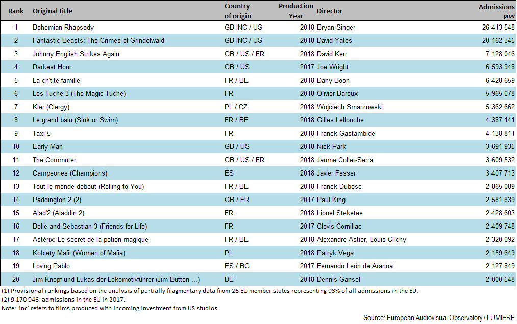Das gesamteuropäische Filmranking in den Tabellen 2 und 3 basiert auf Daten aus den Staaten der Europäischen Union, zu denen Ergebnisse in der Datenbank LUMIERE mit Stand vom 22. April 2019 erfasst waren. Diese Datenbank der Kinobesucherzahlen für Filme, die in Europa angelaufen sind, ist kostenlos online zugänglich. Sie ist das Ergebnis einer Zusammenarbeit zwischen der Europäischen Audiovisuellen Informationsstelle und mehreren nationalen Fachquellen sowie dem MEDIA-Programm der Europäischen Union. LUMIERE enthält Kinobesucherzahlen nach Ländern für rund 49.000 Filme, die seit 1996 in Europa im Verleih sind. Teilweise sind jetzt ebenfalls Daten für 33 europäische Länder sowie den nordamerikanischen Markt für das Jahr 2018 verfügbar.