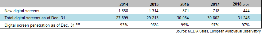 Nach Angaben von MEDIA Salles ist der Digitalisierungsprozess in der EU weitgehend abgeschlossen. Ende 2018 hatten insgesamt 24 EU-Mitgliedstaaten 90 % ihrer Kinosäle oder mehr umgestellt. Lediglich die Slowakei (75 %) und die Tschechische Republik (51 %) [1] vermeldeten einen Digitalisierungsstand unter 80 %. Ende 2018 belief sich die Zahl der digitalisierten Kinosäle auf insgesamt 31.246, was einen geschätzten Anteil von 97 % der gesamten Kinoleinwände in der EU ausmacht