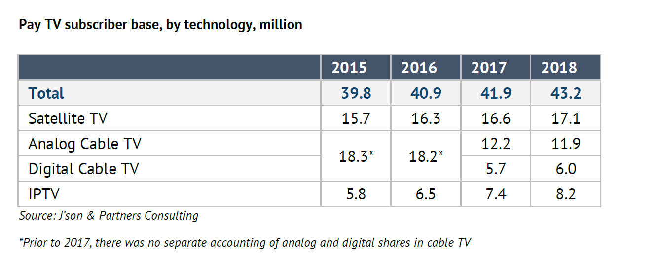Ende 2018 hatten 43,2 Millionen Zuschauer in Russland Pay-TV-Abonnements, 3,1 % mehr als 2017. Unter Berücksichtigung von Umzugszahlen lag die Anzahl der Haushalte mit Pay-TV-Anschluss bei 35-36 Millionen, was 62-63 % der Bevölkerung entspricht, wobei in einem Haushalt genutzte unterschiedliche Arten von Pay-TV-Anschlüssen nicht doppelt gezählt wurden. Das Wachstum gegenüber dem Vorjahr betrug 1 %. J'son & Partners Consulting schätzt, dass die Pay-TV-Umsätze 2018 RUB 95,3 Mrd. (EUR 1,29 Mrd.) betrugen und somit im Vergleich zu 2017 um 14,2 % höher lagen.