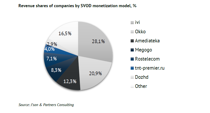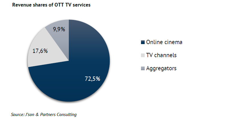 Der Umsatz mit OTT-TV-Diensten erreichte 2018 RUB 8,7 Mrd. (EUR 117,4 Mio.) und stellte damit 9 % des Umsatzes auf dem Pay-TV-Markt (Siehe die Verteilung nach Kategorien in der folgenden Abbildung). Die Basisprognose von J'son & Partners zeigt, dass der Gesamtumsatz der OTT-TV-Dienste um 15,7 % pro Jahr wachsen wird (CAGR). Bis 2023 könnte er RUB 23,4 Mrd. (EUR 315,7 Mio.) erreichen und 20 % des Pay-TV-Marktes betragen. Der Kundenstamm umfasst im Jahr 2018 2-2,5 Millionen Abonnenten, 5-7 % des Pay-TV-Kundenstamms.