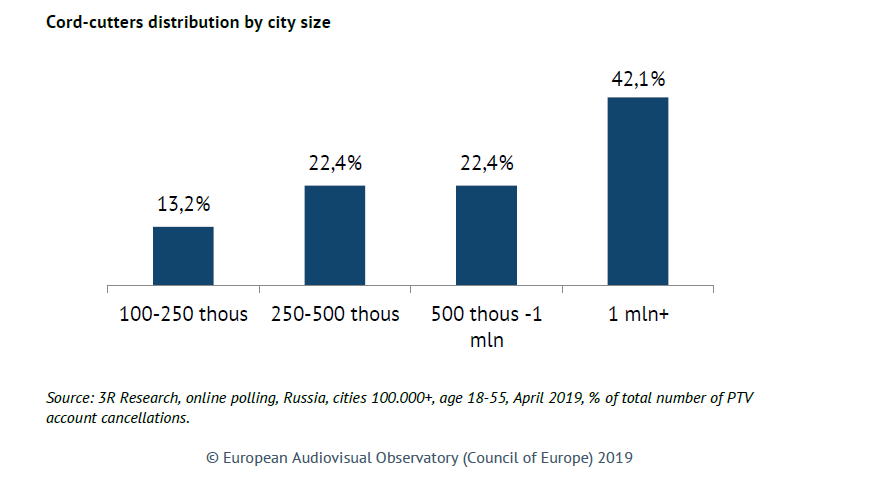 - Die Zahl der Cord-Cutter in Russland von 2017 bis 2019 wird auf 4,3 % der Bevölkerung in Großstädten geschätzt und zeigt keine Tendenz nach oben.