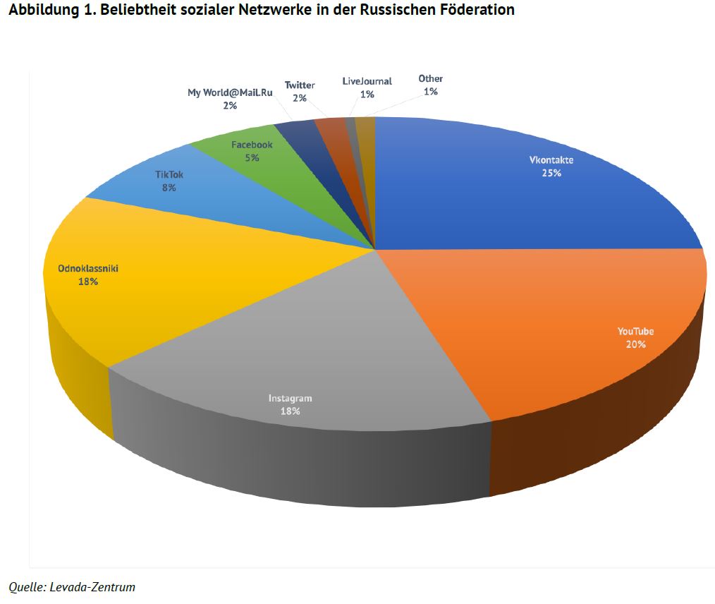 Das zweite Kapitel befasst sich mit dem Zugang zu sozialen Netzwerken und ihrer Verbreitung in Russland. Die Beliebtheitstrends zeigen, dass der Anteil von Vkontakte, YouTube und Instagram stetig steigt, TikTok auf Kosten von Odnoklassniki einen großen Sprung gemacht hat und Facebook auf der Stelle tritt. Drei russische soziale Netzwerke aus der Top-10-Liste - Vkontakte, Odnoklassniki und My [email protected] - gehören zu einhundert Prozent ein und demselben Unternehmen, nämlich der Mail.ru Group Limited mit Sitz in Limassol, Zypern.