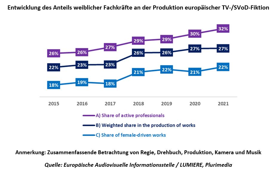 Der Anteil der weiblichen Fachkräfte in der Produktion europäischer TV-Fiktion reicht von weniger als 10 % (Musik, Kamera) bis zu über 40 % (Produktion, Hauptrollen). 37 % der TV-Fiktionsfolgen wurden 2021 von Drehbuchautorinnen geschrieben, jedoch nur 22 % unter weiblicher Regie gedreht.