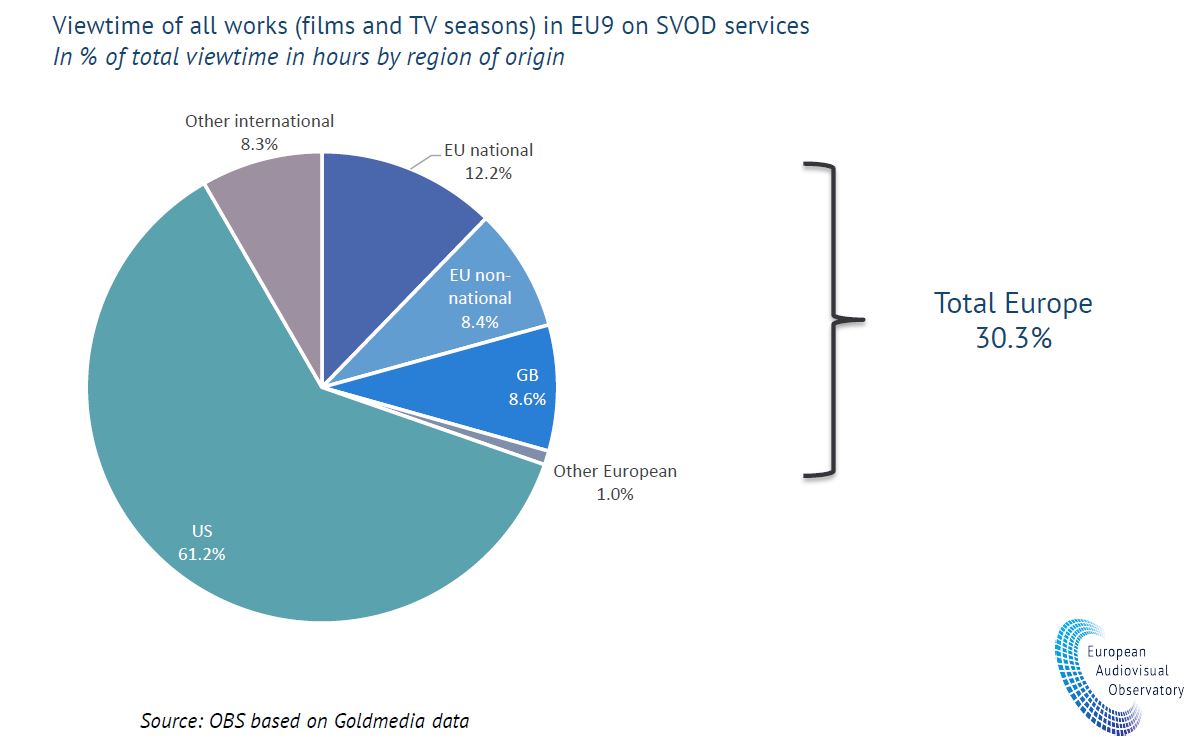 - European works accounted for 30% of SVOD viewing time, including 21% for EU works, 9% United Kingdom works and 1% for other European works.