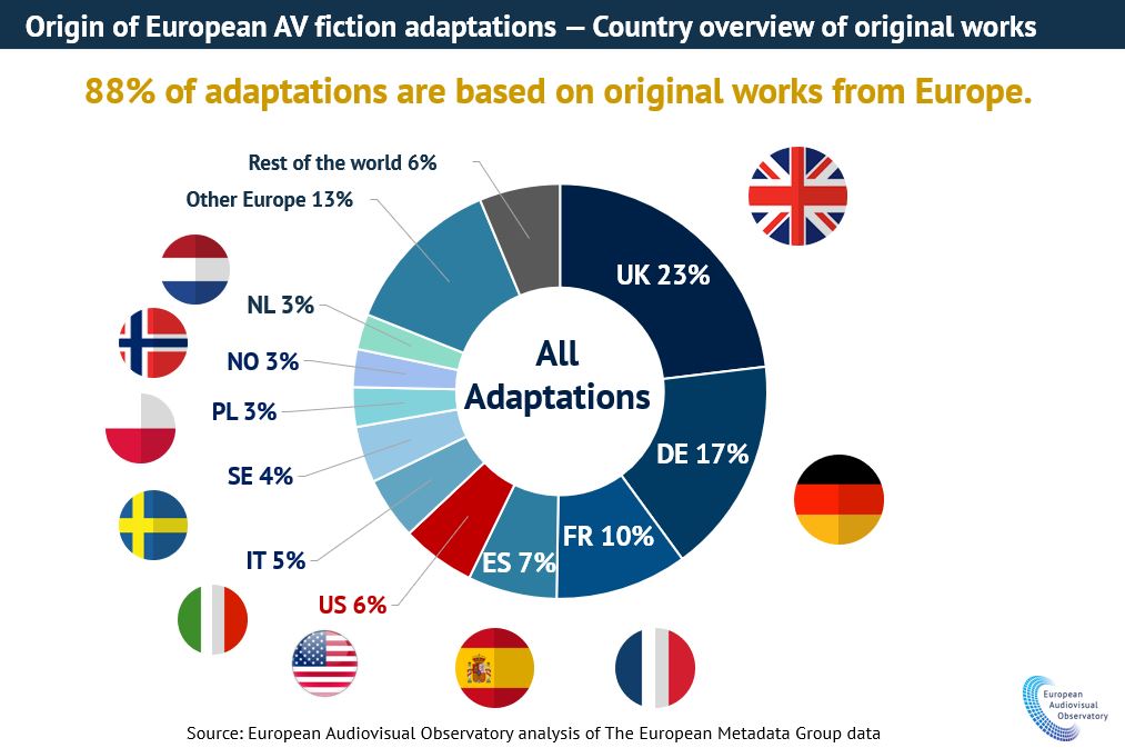 - 88% of European TV and SVOD fiction adaptations are based on original works from Europe.