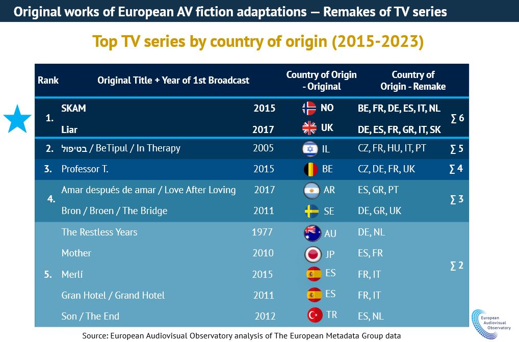 The Norwegian TV series “SKAM” and the British TV series “Liar” have the highest number of remakes in six European countries each. Other popular adapted TV series include Israeli בטיפול / BeTipul (In Therapy) with five European remakes and Belgian Professor T. with remakes in four European countries.
