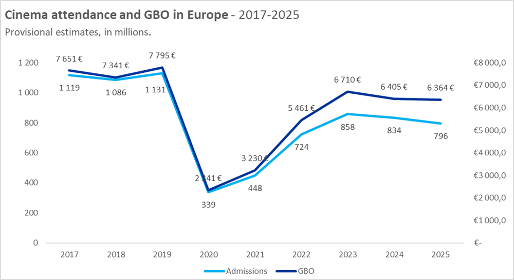 Early estimates from the European Audiovisual Observatory indicate that the downturn in cinema attendance across Europe continued and intensified in 2025, with admissions falling by 5.5% from 843 million (against -1.7% last year), to 796 million admissions. This compares to a 1.7% decrease in 2024 and marks the lowest admissions level since 2022, when admissions totalled 724 million.