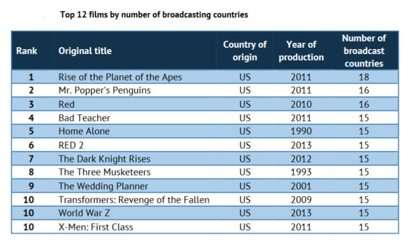 Of the 15 504 film titles broadcast during the 2015 – 2016 season, 47% were produced in Europe and 47% in the US with the rest of the world making up 6%. However a difference appears when one considers that European films were broadcast in 1.4 countries in the same year, while US films were broadcast in 3.1 countries in the year studied. The circulation difference explains why European films represented 47% of single film titles broadcast while accounting for only 28% of cumulated films broadcast.