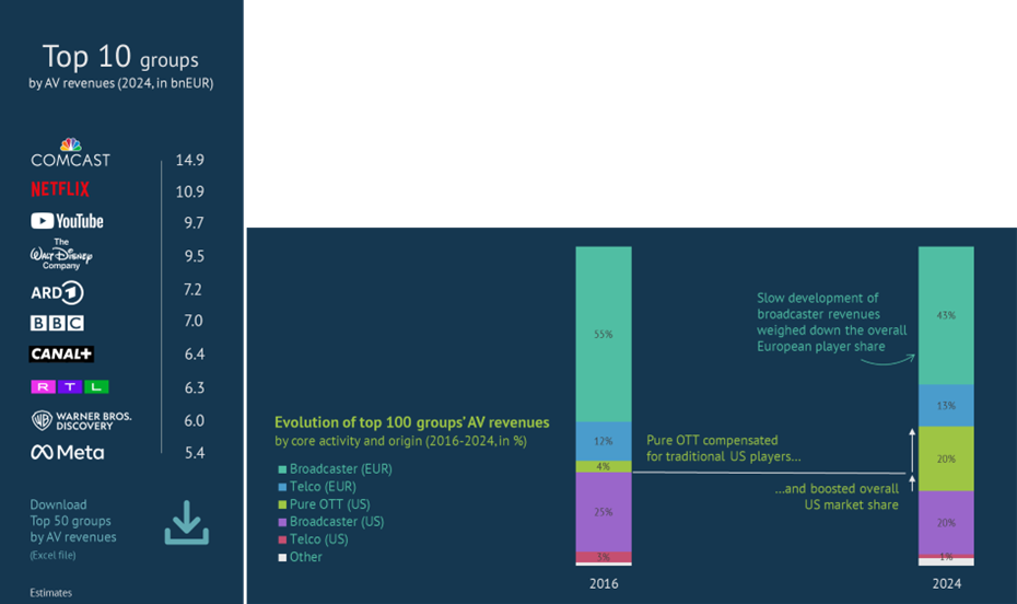Meanwhile, European groups remained dominant in a traditional market that lost significant weight. Consequently, European interests accounted for less than half of the combined traditional and new media AV revenues in 2024.