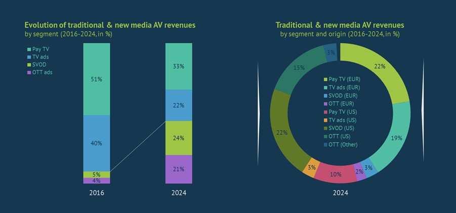 In 2016, the pay-AV service market was almost entirely made up of pay TV, and AV advertising was essentially synonymous with TV advertising. These traditional media segments were banking nine out of every ten euros spent on AV services or advertising. By 2024, SVOD and in-video OTT advertising had become significant new media segments, cumulating nearly half of the audiovisual market. Non-European streamers and VSPs made up the vast majority of this.