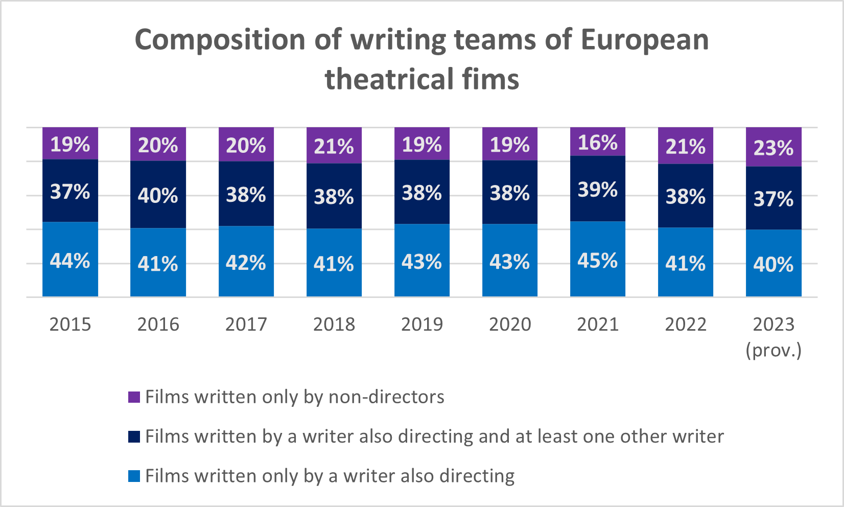 77% of European theatrical films involved a writer who also directed the film. This means, on the one hand, that 48% of screenwriters between 2015 and 2023 only wrote one or more films that they also directed and, on the other hand, that only 55% of screenwriting jobs are allocated to screenwriters who are not also directors.
