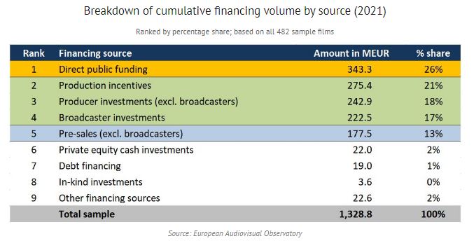 In 2021, the financing of European theatrical fiction films continues to be primarily based on five different financing sources: direct public funding; production incentives; broadcaster investments; producer investments; and pre-sales (Broadcaster investments combine co-production investments by broadcasters with pre-sales made to broadcasters based in any of the co-producing countries. Pre-sales combine national and international pre-sales; pre-sales in the country of origin).